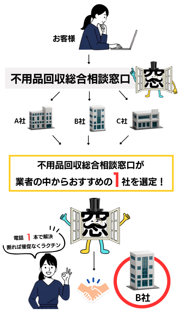 不用品回収総合相談窓口とは、安心してご利用できる不用品回収業者を見つけることができるサービスです。不用品回収のほかに遺品整理やオフィス・店舗の移転作業、片付けなど様々な業者を選べる仕組みとなっています。