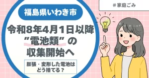 いわき市では、令和8年4月1日から「電池類」の収集方法が変更になります。これまではアルカリ・マンガン・オキシライドの乾電池のみが対象でしたが、改正後は、全ての電池を対象に、年4回の収集が始まります。 本コラムでは、・収集 […]