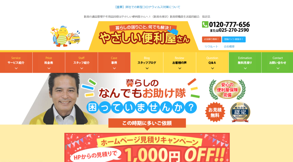 「やさしい便利屋さん」は、暮らしのあらゆる「困った!」を解決する便利屋サービスです。ハウスクリーニングや遺品整理、不用品回収、ゴミ屋敷の片付け、水まわりトラブルの対応、エアコン設置・清掃・修理、引越しのお手伝い、家具の移動・組立、草取りや枝切り、代理代行や害虫駆除、防犯・カギのトラブル、リフォームまで幅広く対応。女性スタッフ対応やシニアサポート、雪かき代行もご用意。法人様も個人様も、お気軽にご相談ください。