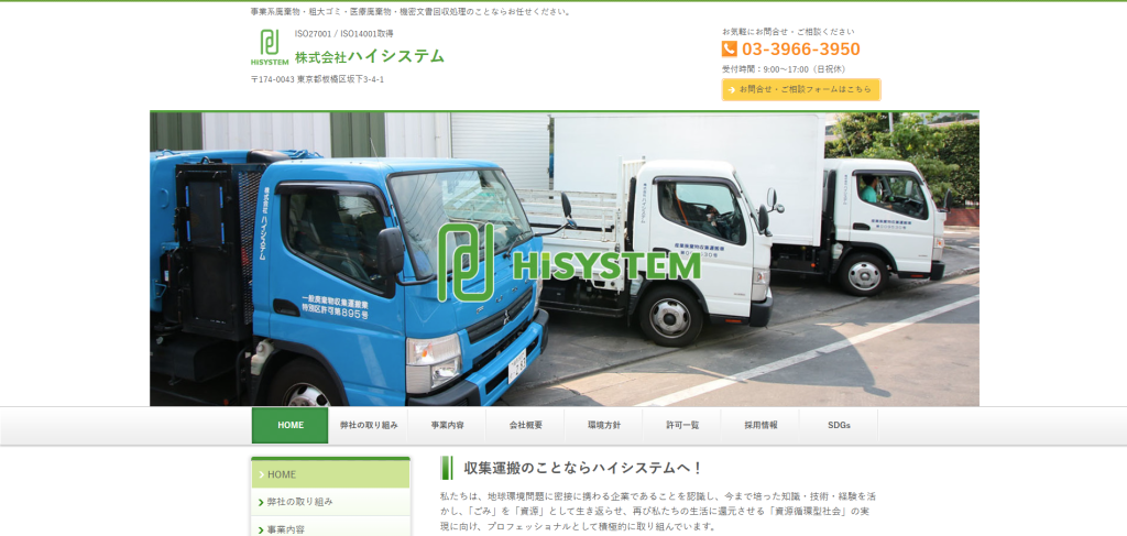 株式会社ハイシステムは、東京都内を中心に、産業廃棄物の収集運搬・中間処理・リサイクルを行う総合環境企業です。廃棄物の分別・減量化を通じて、資源循環型社会の構築に貢献しています。電子マニフェスト対応やISO認証取得など、法令遵守と品質管理にも力を入れています。