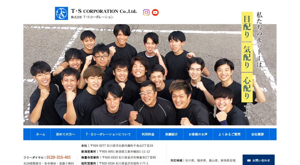 「T・Sコーポレーション」は石川県金沢市・新潟県三条市に拠点を構え、不用品回収・空き家の片付けや管理・粗大ゴミの処分・買取・ゴミ屋敷清掃・遺品整理・エアコンクリーニングなど、幅広いサービスを親切・迅速・安心でご提供。石川・富山・福井・新潟の全域に対応しております。住まいや暮らしのことでお困りの方は、まずはお気軽にご相談ください。お見積り無料です。